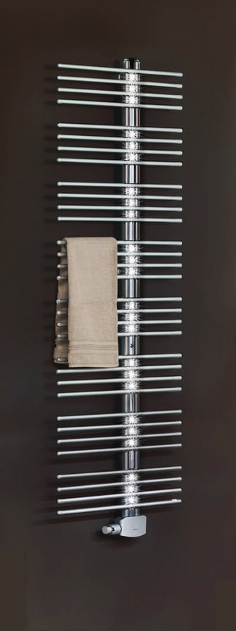 Die geraden, im "Goldenen Schnitt" angeordneten langen und kurzen waagrechten Rohrschenkel ergeben ein ausgewogenes aber auch spannungsvolles Design. Durch die asymmetrische Anordnung der Sammelrohre können bequem grössere und kleinere Handtücher überstreift werden. Der Aurea ist für den Warmwasserbetrieb, kombinierten oder für den reinelektrischen Betrieb vorgesehen.